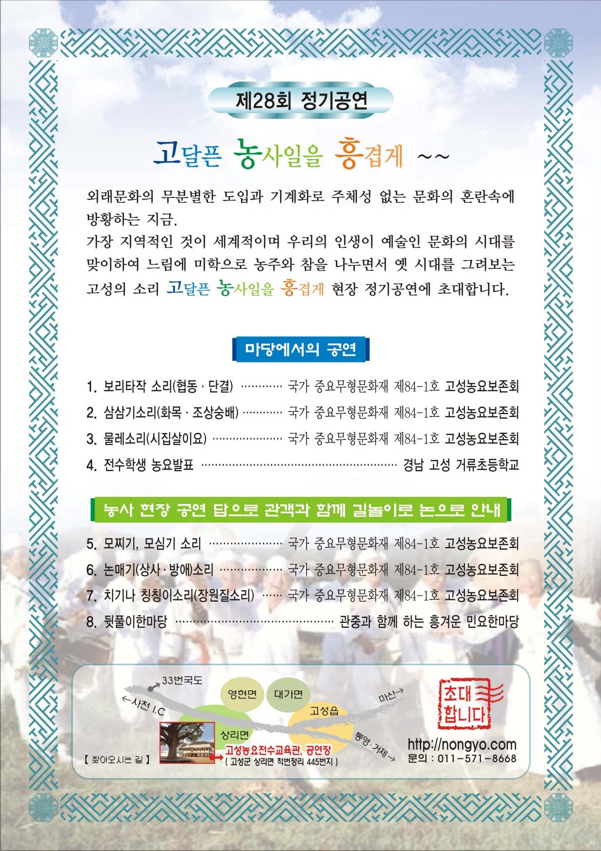 °í¼ºµéÆÇÀÇ Á¶»ó´ÔµéÀÌ °í´ÞÇ ³ó»çÀÏÀ» Çϸ鼭 À̸¶¿¡ È帣´Â ¶¡¹æ¿ïÀ» ¾Ä±â À§ÇÏ¿© ºÒ·¯¿À´ø Èï°Ü¿î ¿ì¸®°¡¶ôÀº °í´ÞÇ ³ó¹ÎµéÀÇ »îÀÇ Ã¶ÇÐÀ̾ú°í  Èï°Ü¿î ⌜½Ã ±è »õ⌟·Î Ç¥ÃâÇÏ¿© ¿À´Ã³¯ ±¹°¡Á߿乫Çü¹®È­Àç(¹«ÇüÀÇ ±¹º¸)·Î ÁöÁ¤¹Þ¾Æ ±¹°¡Àû Â÷¿ø¿¡¼­ Àü½Â°ü¸® µÇ°í ÀÖÀ¸³ª ¿Ü·¡¹®È­ÀÇ ¹ü¶÷°ú ³ó»ç¾ç½ÄÀÇ ±â°èÈ­ µîÀ¸·Î ¿ì¸®Á¶»óµéÀÌ »ì¾Æ¿À´ø ³ó»ç¹æ½Ä°ú ¼Ò¸®ÀÇ Àü½ÂÀº ¿ø·¡ÀÇ ¸ð½ÀÀ¸·Î ÀçÇöÇϱâ´Â ¸Å¿ì ¾î·Á¿î ÇüÆíÀ̸ç Ÿ Áö¿ªÀÇ ³ó¿äµéµµ ³ó»çÇöÀå °ø¿¬À» Èä³»¸¦ ³»´Â Á¤µµ¿¡ ºÒ°úÇÑ Çö½ÇÀÌ¸ç °ø¿¬´äµµ º¸À¯ÇÏÁö ¸øÇÑ Ã¤ Àα٠³íÀ» ÀÓÂ÷ÇÏ¿© ¾î·Á¿òÀ» °¨¼öÇϸ鼭 º» °ø¿¬À» ÇÏ´Â °ÍÀÌ¸ç »ç¶óÁ®°¡´Â ÇâÅä¹Î¿ä¸¦ Àü½Âº¸ÀüÇϱâ À§ÇÏ¿© °í¼º³ó¿ä ȸ¿ø ¸ðµÎ°¡ Èñ»ýÀÌ¿ä ºÀ»ç·Î¼­ ÀÌ ´õÀ§¿¡ ³í¹Ù´Ú¿¡ µé¾î°¡¼­ ¸ð¸¦ Âî°í ½ÉÀ¸¸ç ³íÀ» ¸Å´Â °ø¿¬À» ÇÏ´Â °ÍÀ̱⿡ ¿©·¯ºÐµéÀÇ ´õ¿í µûµíÇÑ °Ý·Á¿Í ¼º¿øÀ» ´çºÎ µå¸®¸ç ÁغñµÈ ³óÁÖ ¸¹ÀÌ µå½Ã°í Áñ°Ì°í º¸¶÷µÈ ÇÏ·ç°¡ µÇ½Ã±â¸¦ ±â¿ø ÇÕ´Ï´Ù °¨»çÇÕ´Ï´Ù.